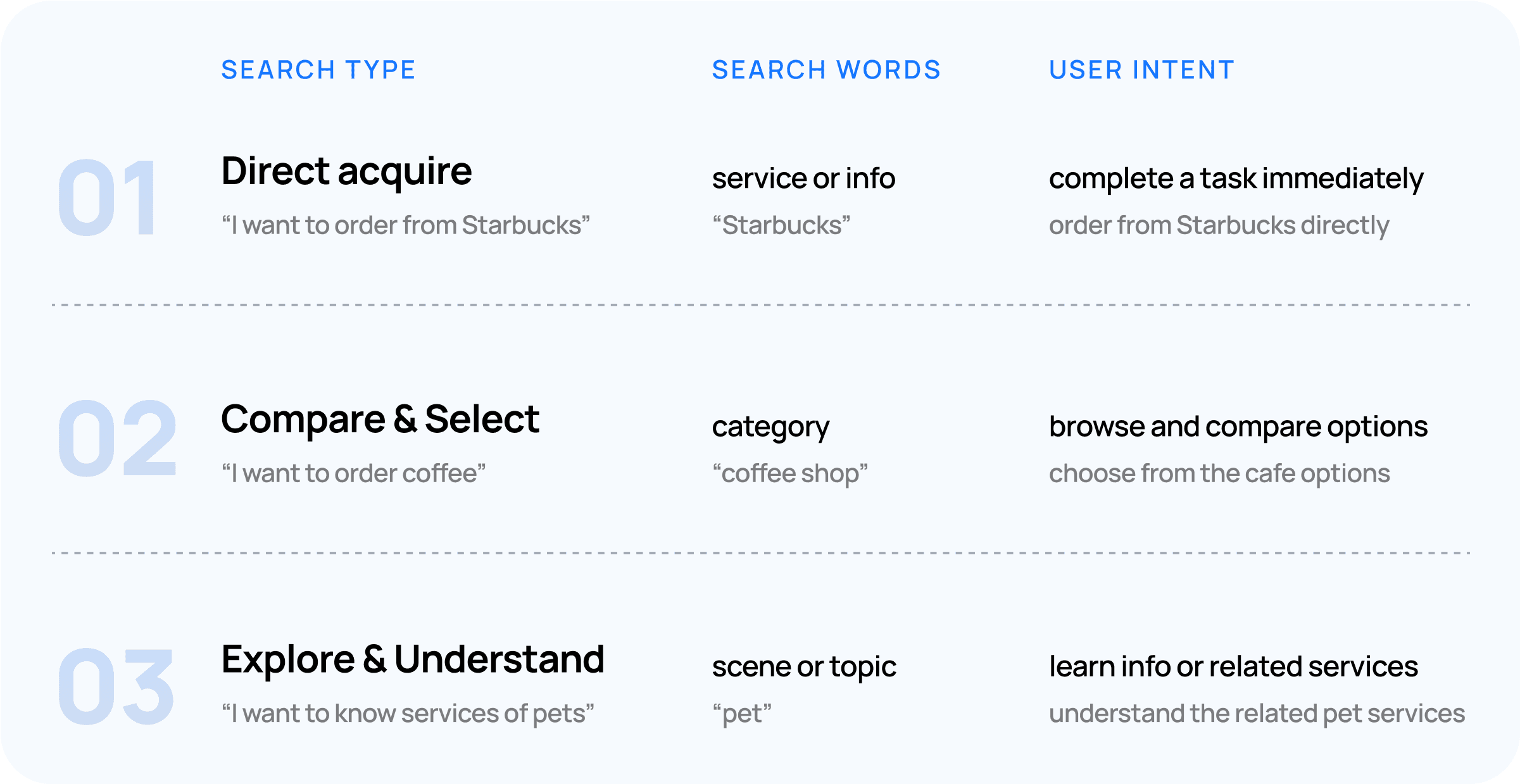 Yes, users’ intentions could be different, when they have more specific goals, they tend to need more direct suggestions and vice versa. So I decided to summarize the search behaviors to better understand users' intentions and expectations: